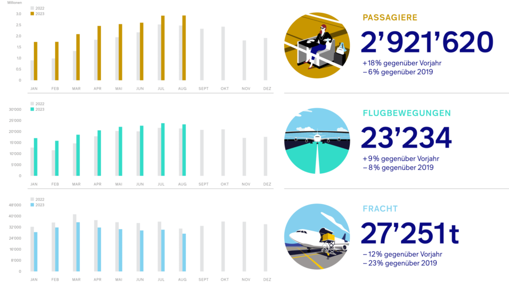 Gegenüber August 2019 liegen die Passagierzahlen im Berichtsmonat bei 94%. Die Anzahl Lokalpassagiere lag im August 2023 bei 2’027’409. Der Anteil der Umsteigepassagiere betrug 30%, was 889’180 Passagieren entspricht.