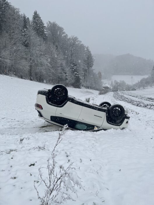 In Brittnau geriet eine Automobilistin auf einer schneebedeckten Strasse ins Schleudern, woraufhin sich das Fahrzeug überschlug und auf dem Dach zum Stillstand kam. Die Lenkerin blieb unverletzt.