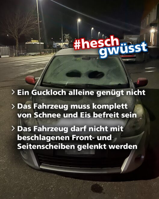 Ein Guckloch alleine genügt nicht. Stelle sicher, dass dein Fahrzeug komplett von Schnee und Eis befreit ist, bevor du wegfährst.