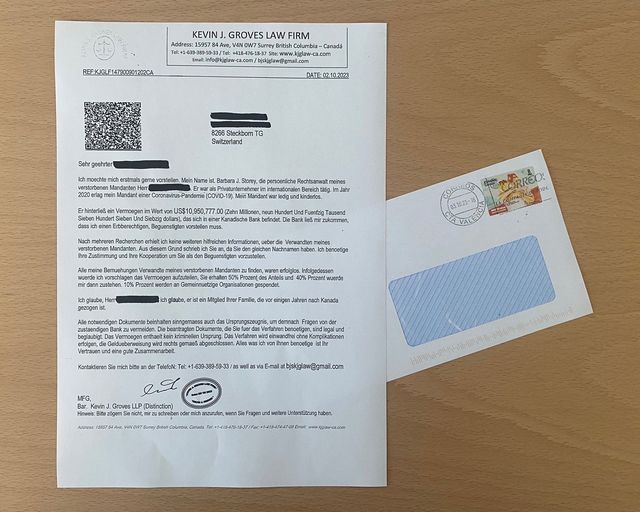 Ignorieren sie das Schreiben, wenn man ihnen Geld aus einem Gewinn oder einer Erbschaft in Aussicht stellt.