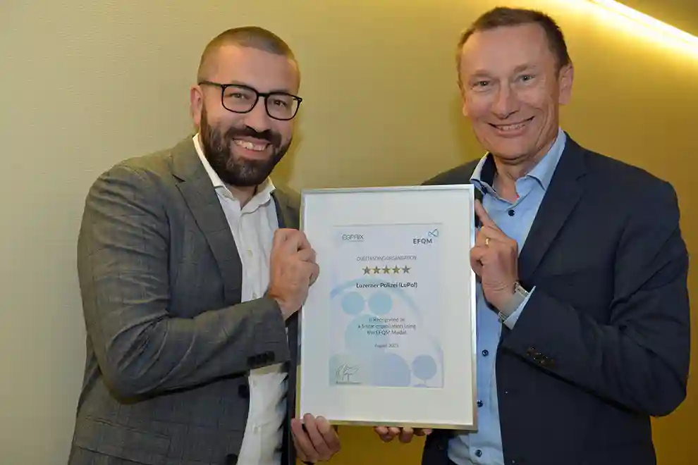 Mit einem umfangreichen Bericht und zahlreichen Assessment-Gesprächen wurde ein Prozess abgeschlossen, bei dem nicht nur die Strukturen, sondern auch die Kultur der Organisation nachhaltig geprüft worden sind. Nun hat die Luzerner Polizei das Resultat erhalten: Sie erreicht die 5-Sterne-Anerkennung des EFQM-Programms. Eine solche Anerkennung haben bislang nur wenige Verwaltungsstellen in der Schweiz erhalten.