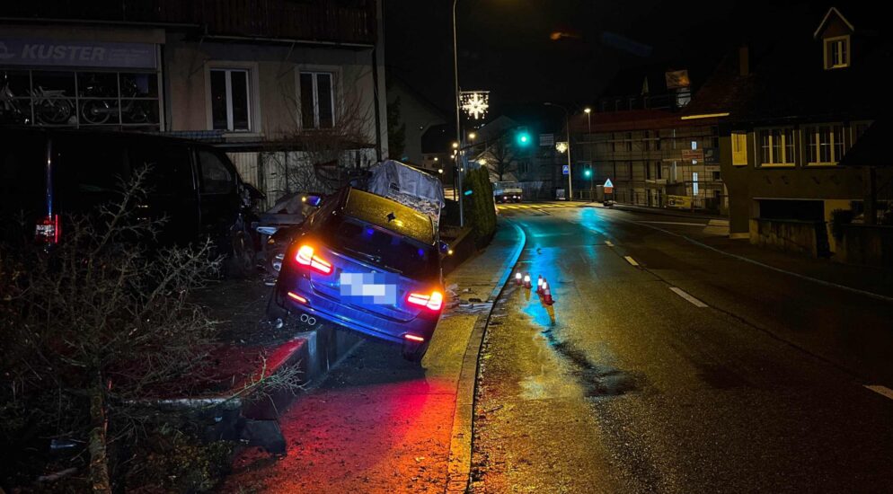 In Niedergösgen ist am frühen Donnerstagmorgen ein Auto von der Fahrbahn abgekommen. In der Folge kollidierte es mit mehreren parkierten Fahrzeugen und Gegenständen auf einem Hausvorplatz.