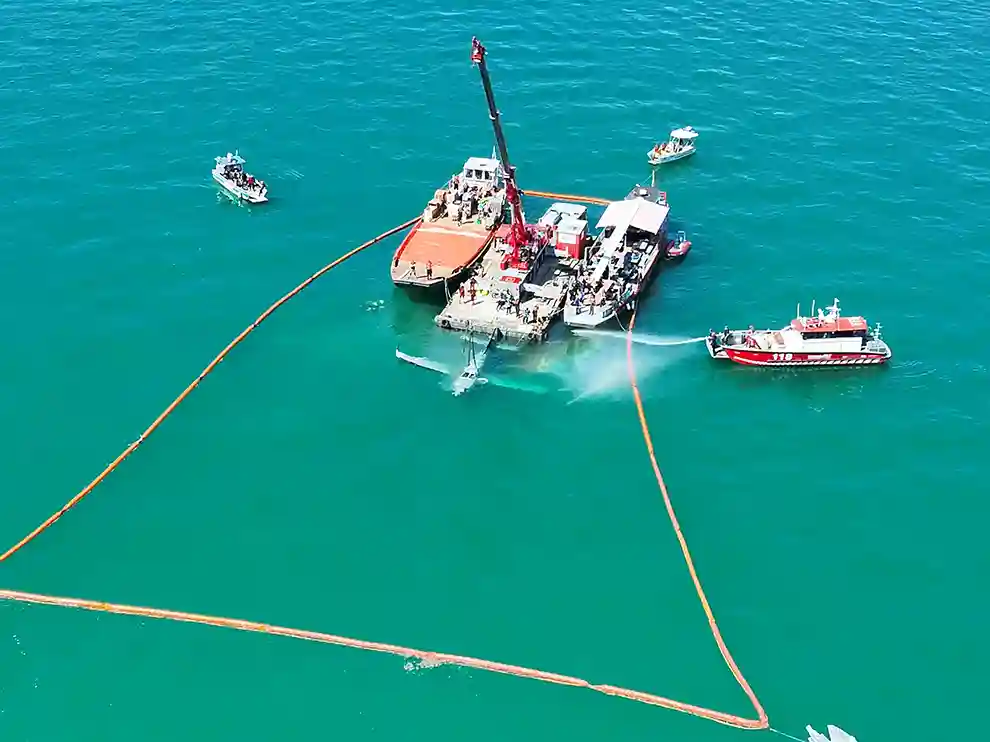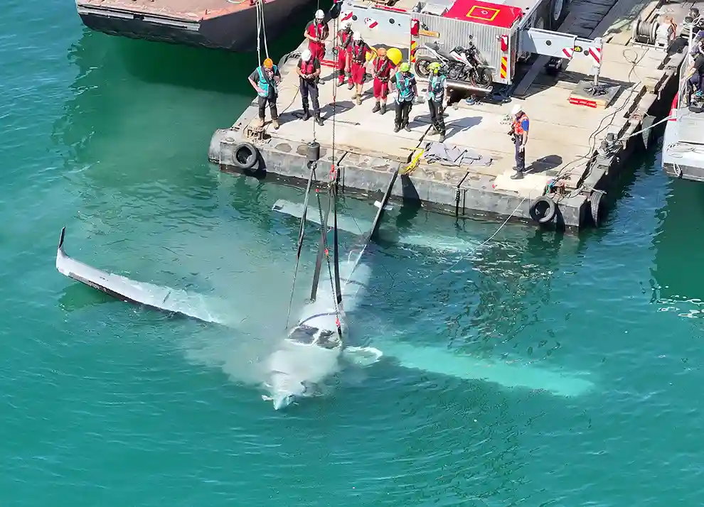 Nach einer sorgfältigen Lagebeurteilung gelang es in einem ersten Schritt am Flugzeug Befestigungspunkte für die Bergung anzubringen. Diese Arbeiten gestalteten sich aufgrund der Tiefe von über 100 Metern und den schwierigen Bedingungen auf dem Seegrund als besonders anspruchsvoll. Das Flugzeug wurde anschliessend mit einem Kran, der sich auf einem Schiff befand, aus dem schlickigen Seegrund gezogen. Kurz vor Erreichen der Wasseroberfläche sicherten Taucher das Wrack. Mit Hilfe einer Hebevorrichtung wurde es aus dem Wasser gehoben, auf ein Transportschiff verladen und anschliessend an Land gebracht. Dort wurde der restliche Treibstoff abgepumpt und das Flugzeug wird für den Weitertransport vorbereitet.