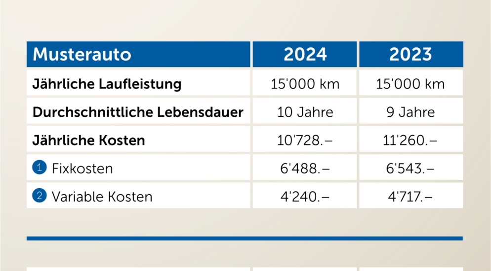 Das für die diesjährige Berechnung verwendete TCS-Musterauto basiert auf einem revidierten Neupreis von 41‘000 Franken (Vorjahr 39‘000 Franken). Die durchschnittliche jährliche Laufleistung beträgt 15‘000 Kilometer. Mit den TCS-Berechnungsansätzen ergeben sich bei diesem Musterpersonenwagen feste Kosten von jährlich 6’488 Franken sowie variable Kosten von 4’240 Franken. Insgesamt kostet das Musterauto somit 10’728 Franken pro Jahr, was einem Kilometerpreis von 72 Rappen entspricht. Mit dieser Kalkulation werden die Fahrzeuge nach 10 Jahren und 150‘000 Kilometer abgeschrieben (Vorjahr noch 9 Jahre und 135’000 Kilometer). Die meisten anderen Detailwerte ergaben nur leichte Veränderungen nach oben und unten.