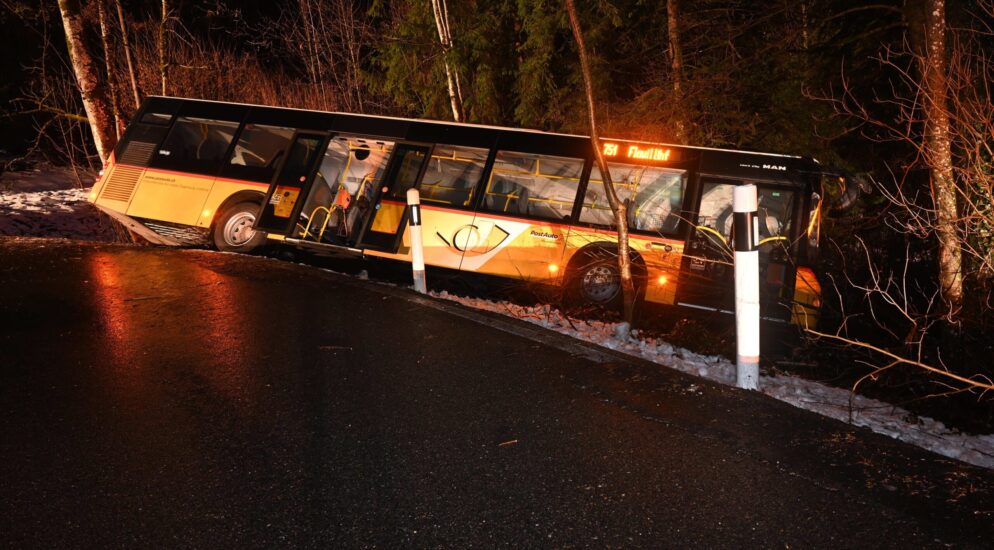 Ein 56-jähriger Chauffeur fuhr mit einem Postauto und drei Passagieren von Degersheim in Richtung Flawil. In einer Rechtskurve geriert das Postauto aus bislang unbekannten Gründen über die Gegenfahrbahn und rutschte über den Fahrbahnrand. Es kam in einer Schieflage in unwegsamen Gelände zum Stillstand.