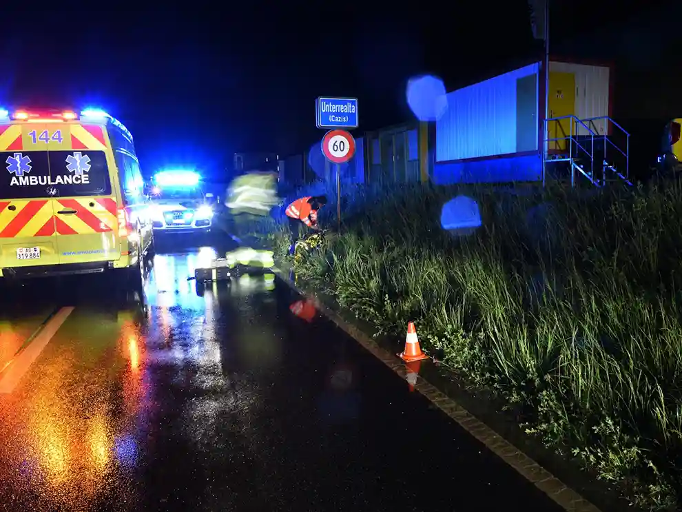 Der 23-Jährige lief am Dienstag vor 21.30 Uhr zu Fuss von der Querverbindung Rothenbrunnen kommend am rechten Fahrbahnrand der Italienischen Strasse H13 in Richtung Cazis. Bei Unterrealta wurde er von einem von hinten kommenden Personenwagen angefahren und an das Wiesenbord geschleudert. Der Personenwagen fuhr weiter. Der Mann, er hatte sich einen Oberschenkelbruch und weitere Verletzungen zugezogen, rief die Einsatzleitzentrale der Kantonspolizei Graubünden an, um Hilfe anzufordern. Ein Team der Rettung Mittelbünden betreute den Verletzten und transportierte ihn ins Kantonsspital Graubünden nach Chur.