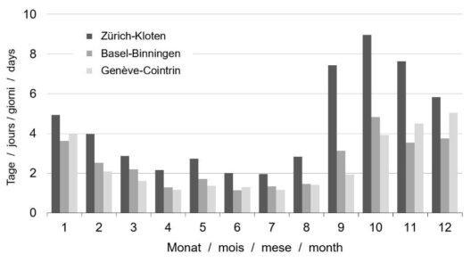 Anzahl Tage pro Monat mit Nebel (Durchschnitt der Periode 1991−2020). Als Tag mit Nebel gilt, wenn an einem der drei täglichen Beobachtungstermine (Morgen, Mittag, Abend) Nebel geherrscht hat. (MeteoSchweiz)
